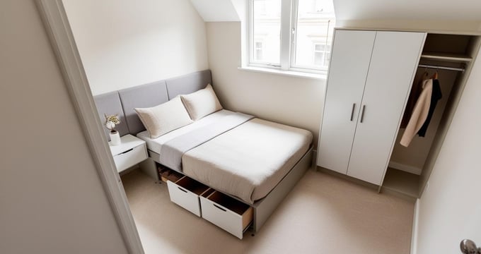 Think: ottoman beds with built-in storage, bedside tables with drawers, or even a floating desk that folds away.