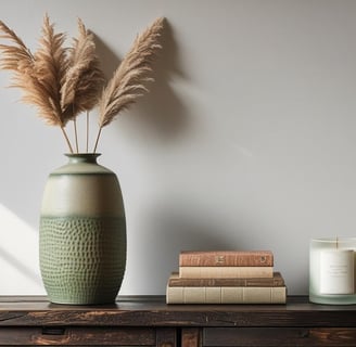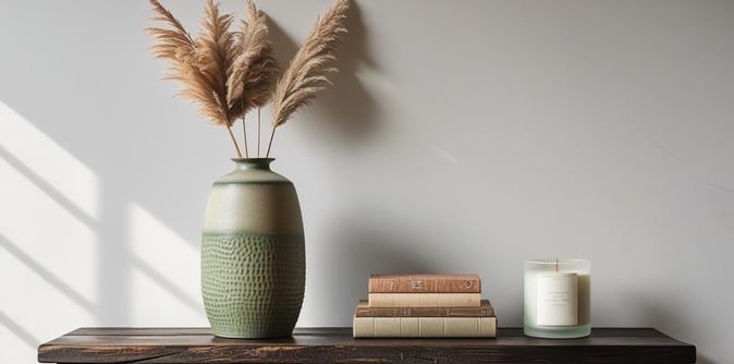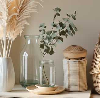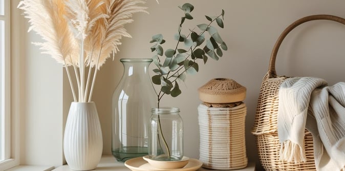 Natural elements like pampas grass, eucalyptus stems, dried flowers, or wooden bowls give your space warmth and texture without clashing with your neutral palette.